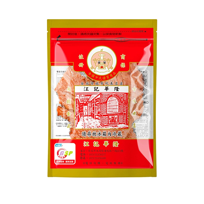成分:豬小里肌肉、醬油、肉桂粉、 蔗糖、大豆水解蛋白、葡萄糖、棕櫚 油 。 添加物:D-山梨醇液(甜味劑)、己二 烯酸鉀(千分之二以下)、檸檬酸鈉、 多磷酸鈉、甘草萃(甜味劑)、醋磺內酯鉀(甜味劑異抗壞血酸鈉(抗氧化劑)、 亞硝酸鈉、香料、菸鹼醯胺、氨基乙酸 、DL-胺基丙酸、L-天門冬酸鈉、5'-鳥 嘌呤核苷磷酸二鈉、5'-次黃嘌呤核苷 磷酸二鈉、琥珀酸二鈉、食用色素紅 色7號、中鏈三酸甘油酯、維生素E。