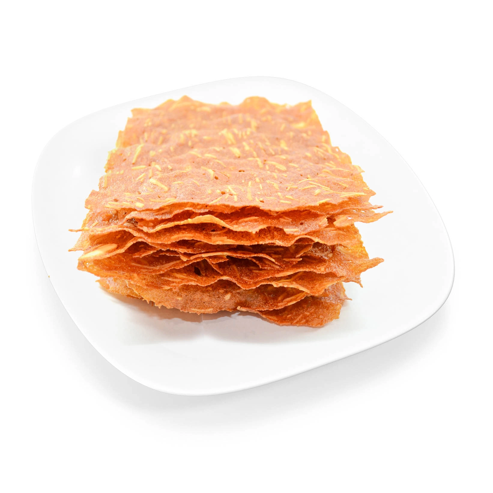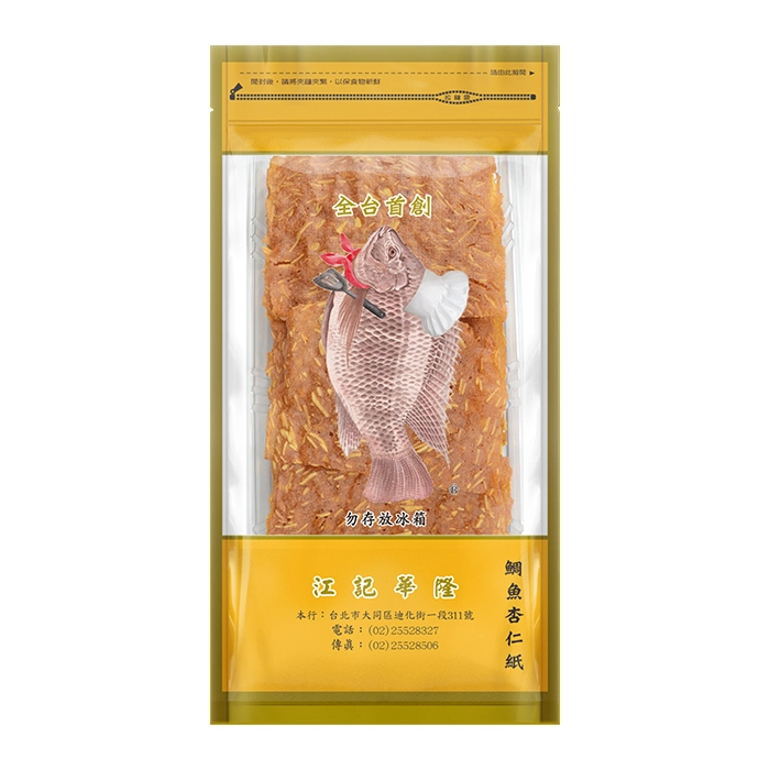 台灣鯛魚於淡海水,混合養殖而誕生,產品長期外銷至美、加、 日、韓等國。含高蛋白質、維生素B、礦物質和多元不飽和脂肪酸等營養素,脂肪熱量低,融合美國進口杏仁片,營養豐富 現代人零嘴食品,本行命名台灣鯛魚杏仁紙,全台首創。