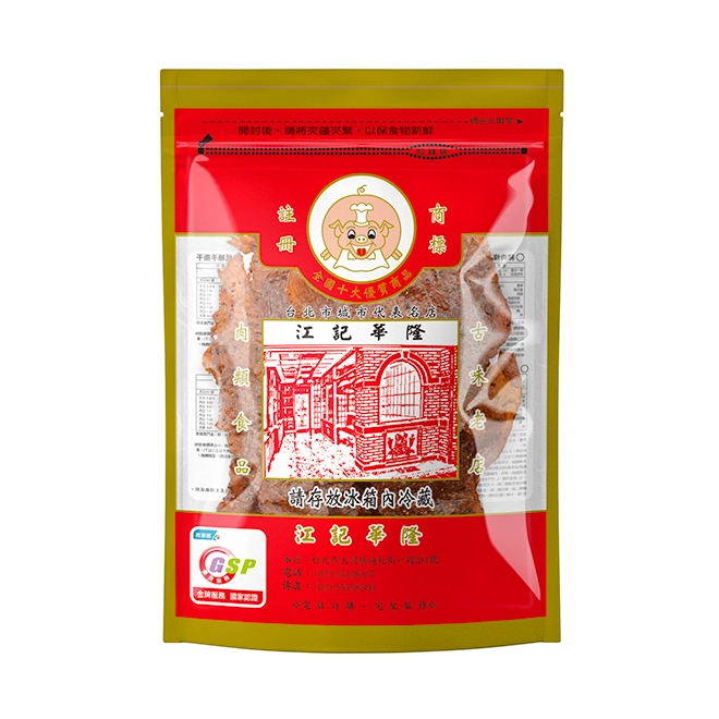 江記華隆黑胡椒豬肉紙採用用俗稱腰內肉,每隻豬取大約2斤左右,經過特殊中藥及醬油,搭配獨家秘方,以真空按摩方式將原料完全入味,低膽固醇完全沒有油質,入口柔軟,搭配黑胡椒粒,感受特殊的懷舊香味。