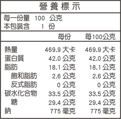 成分:鯛魚肉、糖、杏仁片、醬油(非基 因改造)、氯化鈉(鹽巴)、肉桂粉、醣類。 添加物:D-山梨醇液(非基因改造)、L-麩 酸鈉、醋酸澱粉、甘草素、甘草萃(甜味 劑)、醋磺內酯鉀、亞硝酸鈉。