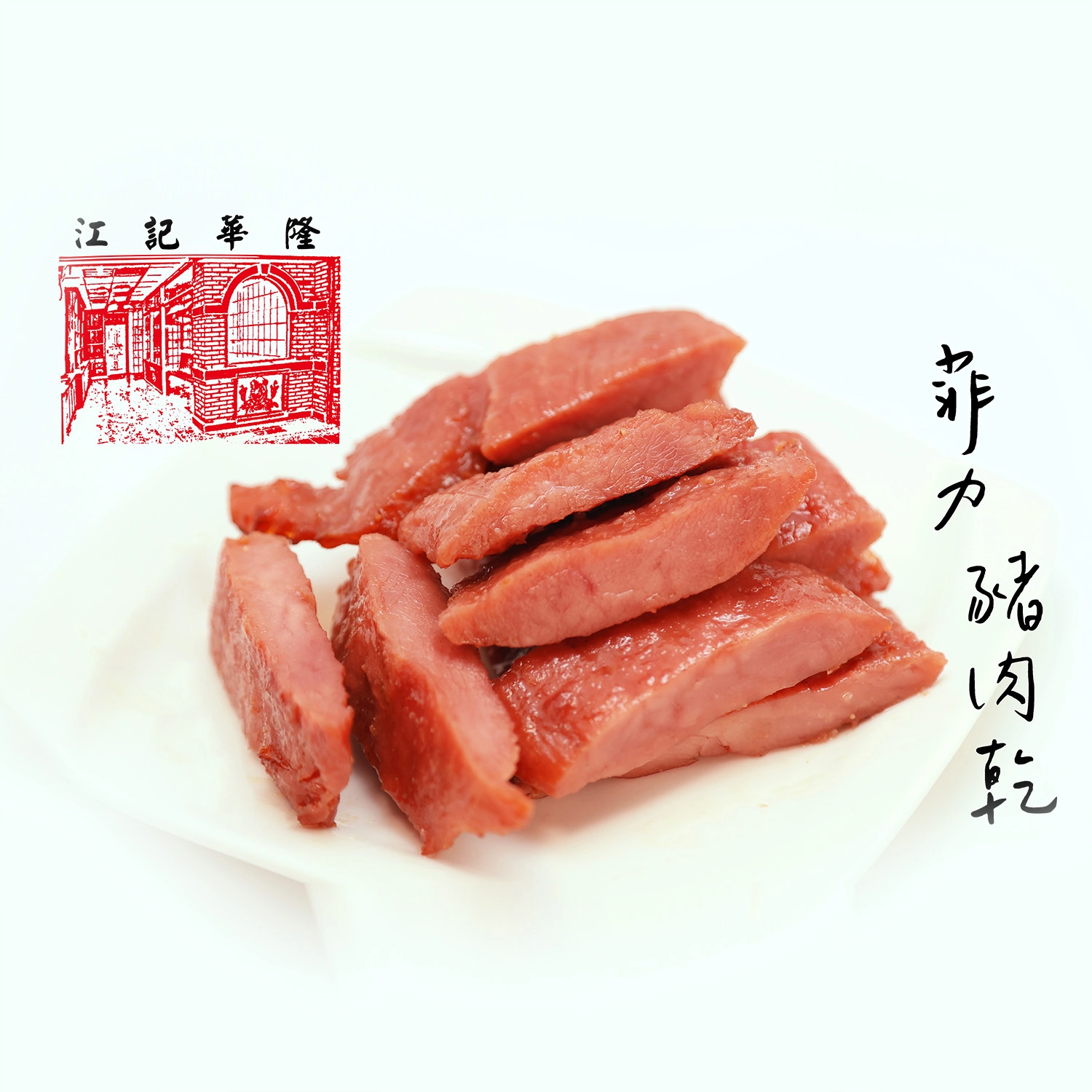 江記華隆菲力豬肉乾使用俗稱腰內肉,每隻豬取大約2斤左右,經過特殊中藥及醬油,搭配獨家秘方,以真空按摩方式將原料完全入味,低膽固醇完全沒有油質,入口柔軟,風味獨特香醇。